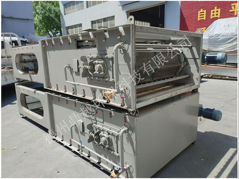 內進流格柵涂污機是一種新型的細格柵清污設備,采用連續攔截并清除流體中的固體雜物,可以達到好的清污效果,如扁平的固體、雜草、瓜殼等,尤其是傳統細格柵難以攔截的毛發纖維類污物,可大大降低后續處理工序的負荷。內進流式格棚主要由驅動裝置、機架、牽引鏈條、提升的網板、沖中洗系統及電氣控制柜等主要部件組成。機架安裝于格柵渠的,機架兩側與格柵渠之間的間隙為格柵濾后出水的通道。在機架的迎水端兩側與渠壁間布置了導流擋板,其在導流的同時,可防止污水短流由濾前直接進入濾后。機架下部迎水端開有一個進水洞口,其對側為封閉端。