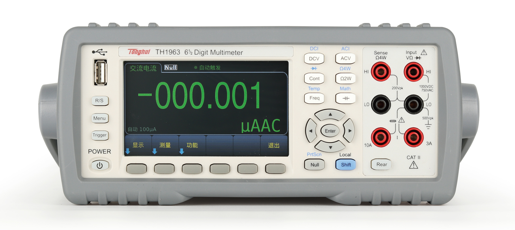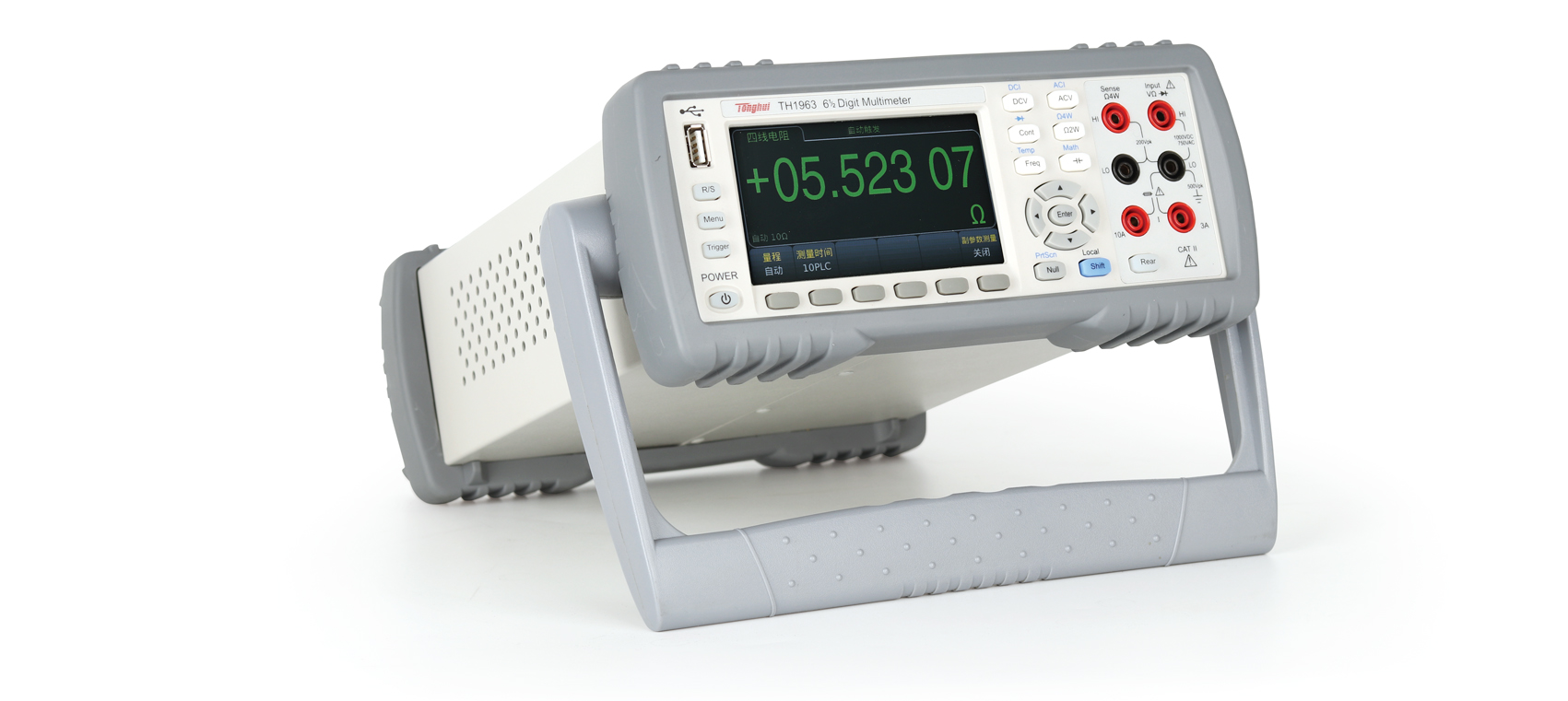 TH1963 六位半數(shù)字多用表應用■ 生產(chǎn)線工作臺■ 維修工作臺■ 教學實驗室■ 自動化測試設備技術參數(shù)產(chǎn)品型號TH1963顯示器4.3寸LCD彩色顯示屏顯示位數(shù)1199999字讀數(shù)測量參數(shù)直流電壓、交流電壓、直流電流、交流電流、直流電阻、電容、頻率、導通、二極管、溫度顯示方式直讀、直方圖、條形圖、趨勢圖測量速度最高1000次/S數(shù)學功能清零功能、最小值/最大值/平均值/標準偏差、dB、dBm通用