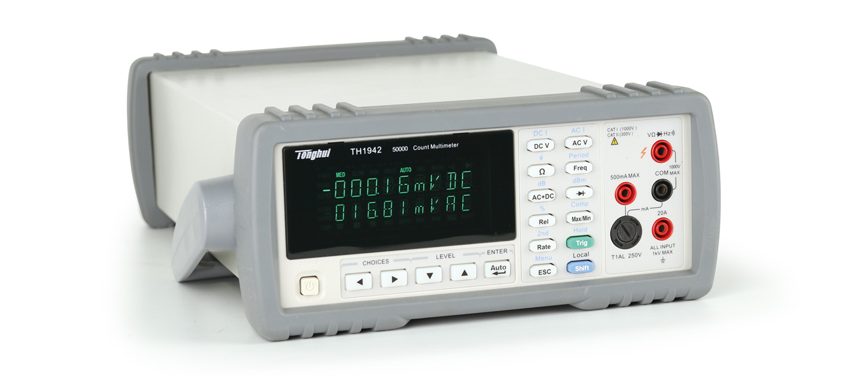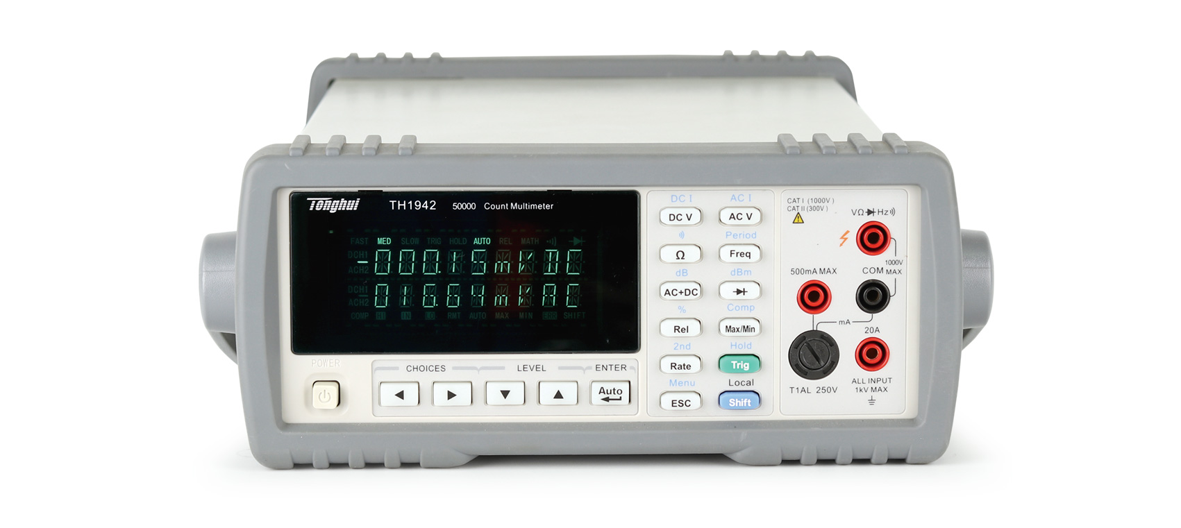 ■ TH1941型 4 1/2位真有效值數字多用表及TH1942型50,000讀數數字多用表是一種多功能、高性價比的電壓/電流/電阻測試儀器。儀器可以比同檔產品高數倍的測量速度進行穩定測量。提供21,000/51,000字最大讀數,0.03%/0.02%的最高直流電壓準確度等一系列優良的性能和經濟的價格為廣大客戶提供最優的選擇。TH1941/TH1942提供高亮度VFD雙顯示器,可同時測量顯示交流/直流電壓或電流、交流電壓/電流和頻率等參數,不僅大大提高了測量效率,而且測試顯示一目了然。機內采用SMD器件以減小整機密度,降低體積。 儀器配備標準的USB通訊接口,同時可提供通用的通訊軟件以滿足與計算機通訊、數據分析、統計、構建自動測試系統的需要。儀器接受SCPI(可編程儀器的標準命令)命令,以保證通訊軟件的兼容性。